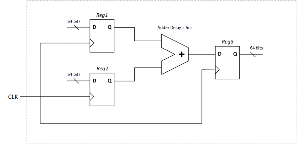 Consider an example as shown in Figure 1, where we have only one clock (of 2ns period) in our design and we are performing a 64-bit addition of two buses. The input buses to the adder, as well as the output bus from the adder are registered. The maximum delay of the adder is estimated to be around 5ns, and the period of the register clock is 2ns. Since the adder delay in more than time period of the clock, it is not possible to close the timing within one clock cycle.