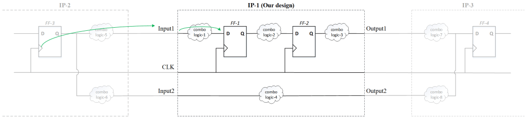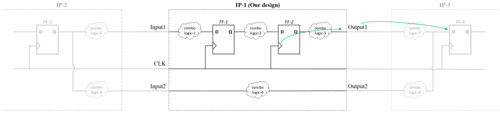 Instead we take advantage of the fact that IP-2’s output logic (combo logic-5) and our design’s input logic (combo logic-1) or our design’s output logic (combo logic-3) and IP-3’s input logic (combo logic-7) is always constrained by a full clock period; in other words the sum of delays for both the cases should be equal to or less than the time period.
