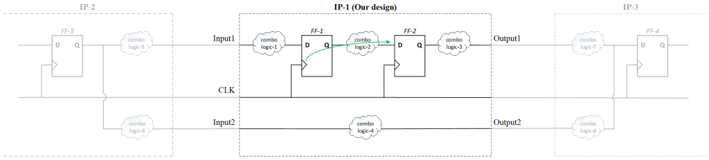 But you may think, why we are discussing this! Because in practical we will never have a purely combinational logic IP. That is true, but what if this is the case (notice the clock of the FF-5 and FF-6; we don’t have CLK-2 in our design ) –