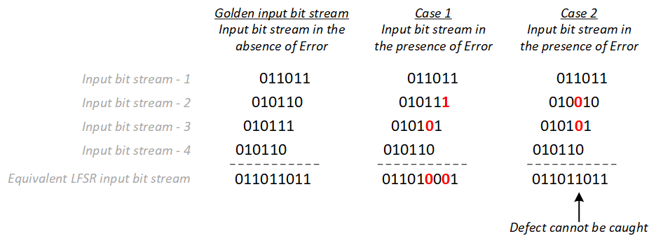 Assuming there is no aliasing, the signature generated in Case 1 will be different that the golden signature. However the signature generated in Case 2 will be same as the golden signature as the equivalent LFSR input bit stream in the presence of error is same as the golden input bit stream. This is known as Masking.
