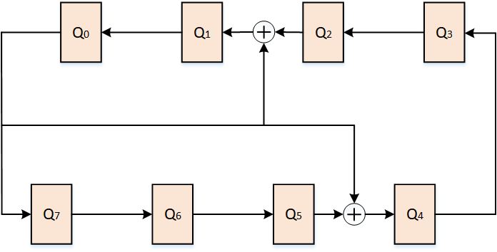 To avoid these issues, EDT uses a Ring LFSR structure (called Ring Generator). This is a simple LFSR structure folded back on itself to form a ring with multiple tap points. Shown below is an example of a simple 8 bits Ring Generator implementing the polynomial, f(x) = x8 + x5 + x2 + 1.